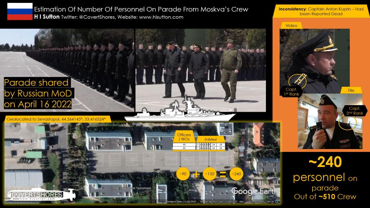 Експерт за допомогою супутникових знімків та відео, опублікованого Міноборони РФ, підрахував, що на крейсері були присутні близько 240 осіб, водночас приблизний склад екіпажу "Москви" - 510 осіб. А за оцінкою російського видання The Insider, на плацу перебувала сотня моряків.