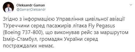 Український дипломат Олександр Гаман повідомив на своїй Twitter-сторінці, що згідно з інформацією Управління цивільної авіації Туреччини серед пасажирів літака Fly Pegasus (Boeing 737-800), що виконував рейс за маршрутом Ізмір-Стамбул, громадян України серед постраждалих немає.