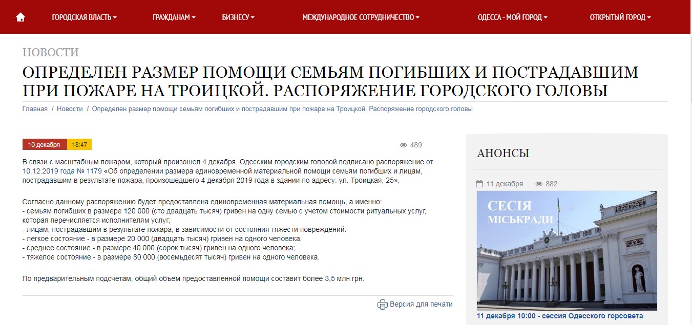 Кабмін виділить майже 4 мільйони гривень, які підуть на ліквідацію наслідків пожежі в коледжі Одеси і надання матеріальної допомоги сім'ям загиблих.