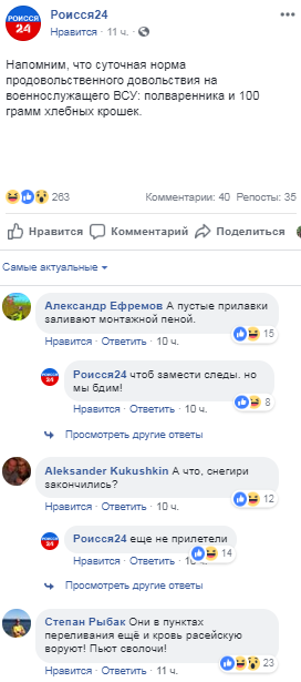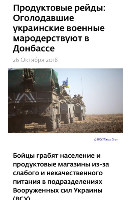 Так, в одному з таких "видань" 26 жовтня розповіли про "голодуючих бійців ЗСУ", які на грунті "слабкого і неякісного харчування грабують населення і продуктові магазини", а також про "постійні п'янки і конфлікти" в українській армії.