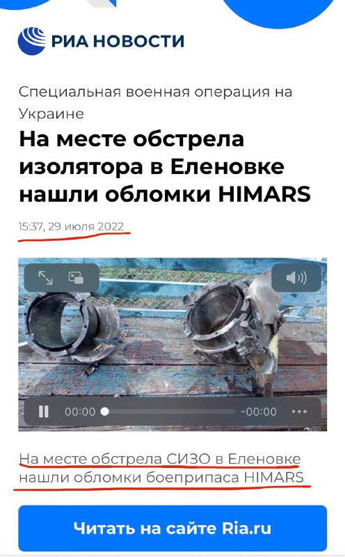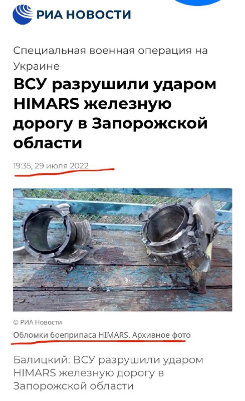 "На місці обстрілу ізолятора в Оленівці знайшли уламки HIMARS", "ЗСУ зруйнували ударом HIMARS залізницю в Запорізькій області" - обидві новини від 29 липня російські пропагандисти супроводжували однаковою фотографією.