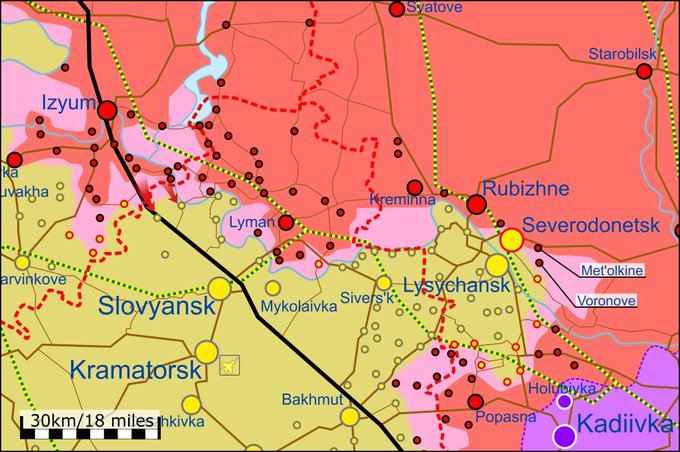 У публікації сказано, що внаслідок запеклих боїв у Луганській області окупаційним формуванням вдалося встановити контроль над населеними пунктами Метьолкіне та Воронове. Зазначені селища розташовані неподалік Сєверодонецька, який ЗС РФ продовжують безуспішно штурмувати.