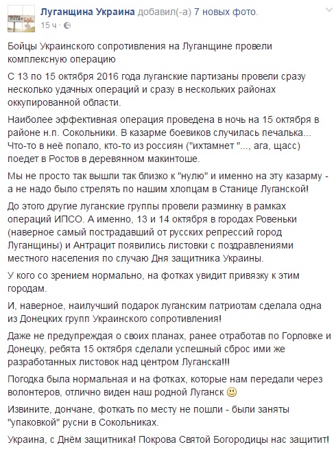 Відзначається, що найбільш ефективну операцію луганські партизани провели в ніч на 15 жовтня в районі населеного пункту Сокільники, де було знищено кілька солдатів російської армії.