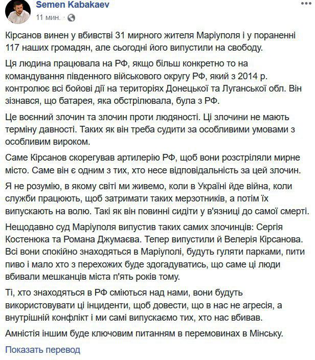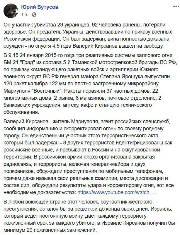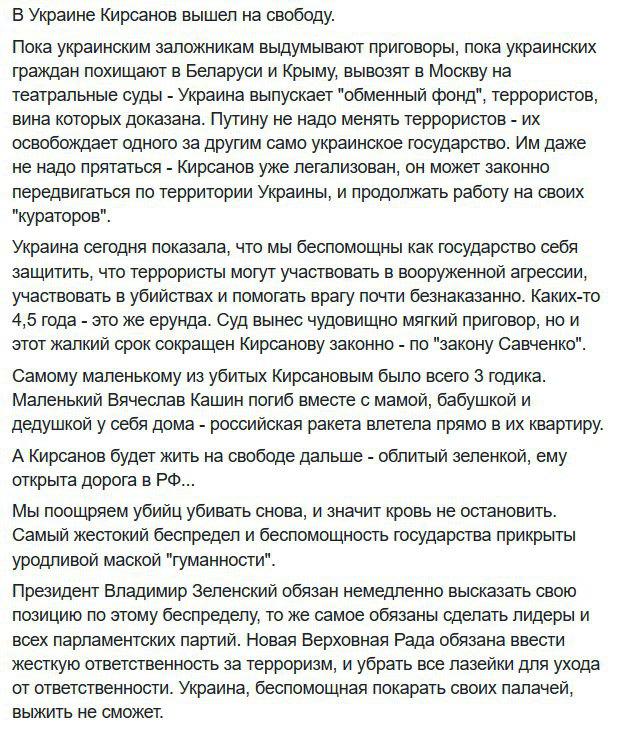Як відомо, Кірсанов був засуджений до дев'яти років позбавлення волі, але вийшов на свободу по "закону Савченко".