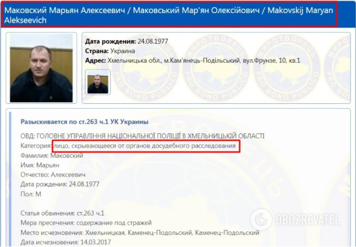 Один із затриманих - 43-трирічний Мар'ян Маковський із Кам'янця-Подільського Хмельницької області - в 2017 році був оголошений у розшук як особа, що переховується від органів досудового розслідування. Інформація про нього залишилася на сайті "Миротворець". Його розшукували за ст. 263 (незаконне поводження зі зброєю, боєприпасами або вибуховими речовинами).