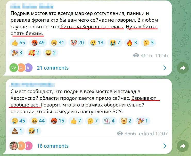 Основну увагу в російсько-українській війні зараз зосереджено на можливій битві за тимчасово окупований Херсон – 9 листопада було підірвано три мости у Херсонській та Миколаївській областях, а у ворожих Telegram-каналах розганяють паніку.