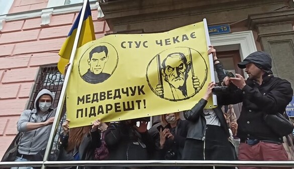 На вході до будівлі Печерського райсуду Києва активісти розгорнули банер з написом: "Стус чекає. Медведчук під арешт!", а також почали скандувати: "Медведчук під арешт!".