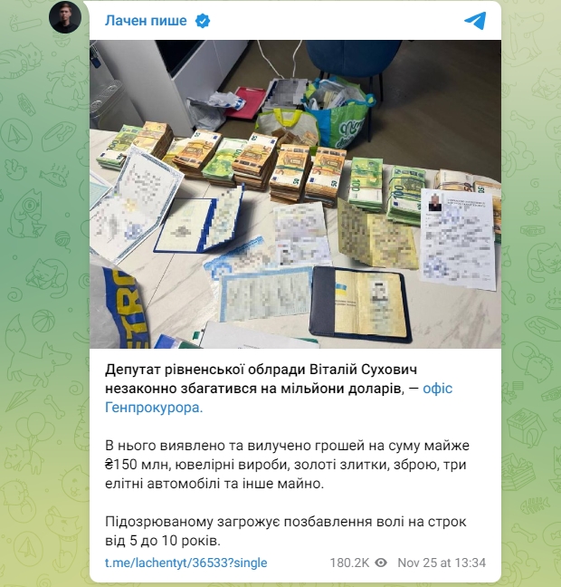 ДБР виявило у депутата Рівненської обласної ради Віталія Суховича, який є також заступником голови Поліського лісового офісу ДСГП "Ліси України", незаконний стан майже 150 мільйонів гривень готівкою, ювелірні вироби, золоті зливки, зброя, три елітні автомобілі та інше майно.