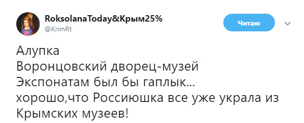 "Алупка. Воронцовський палац-музей. Експонатам був би гаплик... добре, що Россіюшка все вже вкрала з Кримських музеїв!", - з сарказмом зазначила блогер.