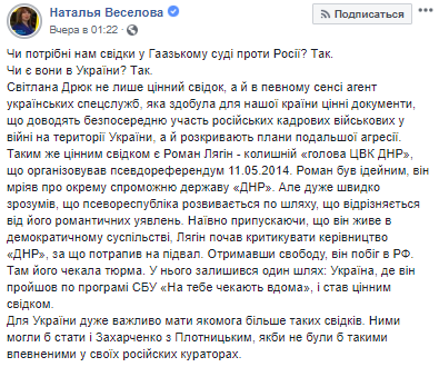 "Чи потрібні нам свідки у Гаазькому суді проти Росії? Так. Чи є вони в України? Так. Світлана Дрюк не лише цінний свідок, а й в певному сенсі агент українських спецслужб, яка здобула для нашої країни цінні документи, що доводять безпосередню участь російських кадрових військових у війні на території України, а й розкривають плани подальшої агресії.