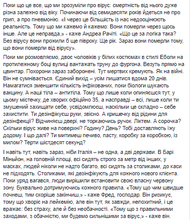 "Похорон зараз заборонені. Тут мертвих кремують. Як на війні. Єдиний вихід - всім залишатися вдома 20 днів. Намагатися зменшити кількість інфікованих, поки біологи шукають вакцину. А наші тіла - антитіла. Тому що тільки коли опиняєшся тут, в цьому місті, де хворих офіційно 35, а насправді - усі, тільки коли ти змушений захищати себе, розумієш, наскільки це складно - себе захистити", - пише вона.