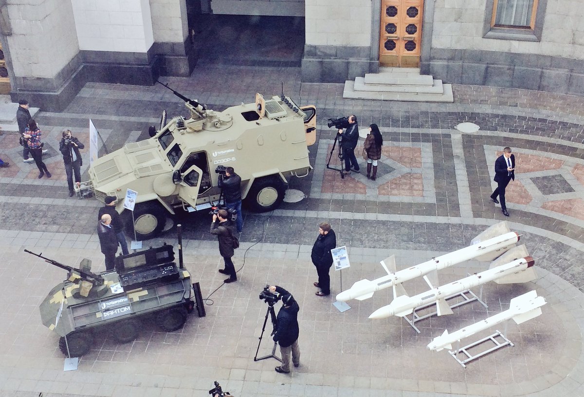 Для демонстрації народним депутатам привезли скандальний "Дозор-Б", радіокеровану бронемашину "Фантом" та інші зразки озброєння. У тому числі, в дворику українського парламенту представили ракети вітчизняного виробництва.