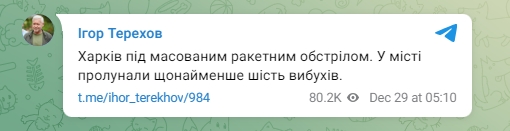 "Харків під масованим ракетним обстрілом. У місті прогриміли щонайменше шість вибухів", - написав мер міста Ігор Терехов.