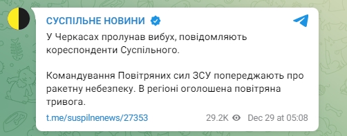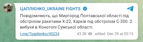В ніч на 29 грудня росіяни знову атакували Україну ракетами зі стратегічних бомбардувальників. Вибухи лунали у Харкові, Миргороді, Черкасах, Львові.