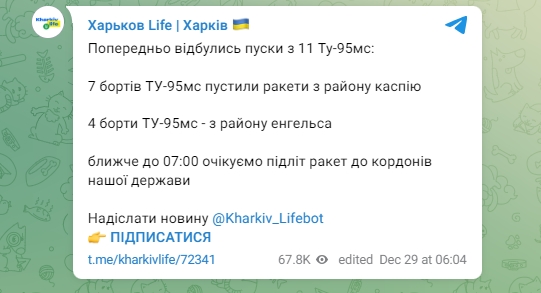 "Попередньо відбулися пуски з 11 Ту-95мс: 7 бортів ТУ-95мс пустили ракети з району Каспію. 4 борти ТУ-95мс - з району Енгельса. Ближче до 07:00 очікуємо підліт ракет до кордонів нашої держави", - йдеться у повідомленні.