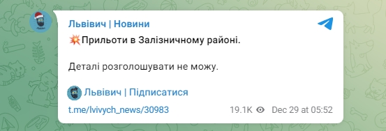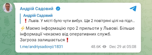 "Є інформація про 2 прильоти у Львові. Більше інформації чекаємо від оперативних служб", - написав мер Андрій Садовий.