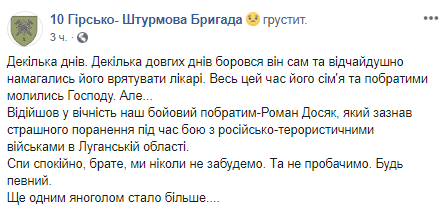 "Декілька днів. Декілька довгих днів боровся він сам та відчайдушно намагались його врятувати лікарі. Весь цей час його сім'я та побратими молились Господу. Але...Відійшов у вічність наш бойовий побратим-Роман Досяк, який зазнав страшного поранення під час бою з російсько-терористичними військами в Луганській області.Спи спокійно, брате, ми ніколи не забудемо. Та не пробачимо. Будь певний. Ще одним янголом стало більше....", - йдеться у повідомленні.
