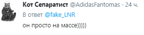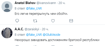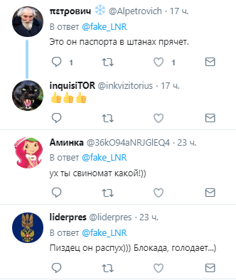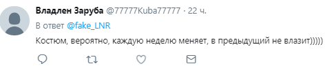 "Він просто на масі)", "Це він паспорта в штанях ховає", "ух ти свіномат який!", "Піз*ець він розпух))) Блокада, голодує...)", "Костюм, ймовірно, щотижня змінює, в попередній не влазить)", "Його легше перестрибнути ніж обійти", "Недобре заздрити досягненням братської республіки", - пишуть не без сарказму користувачі.