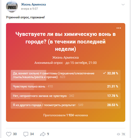 З результатів проведеного опитування в групі "Життя Армянська" видно, що більшість жителів не тільки відчувають в місті їдкий запах, але і скаржаться на погіршення самопочуття.