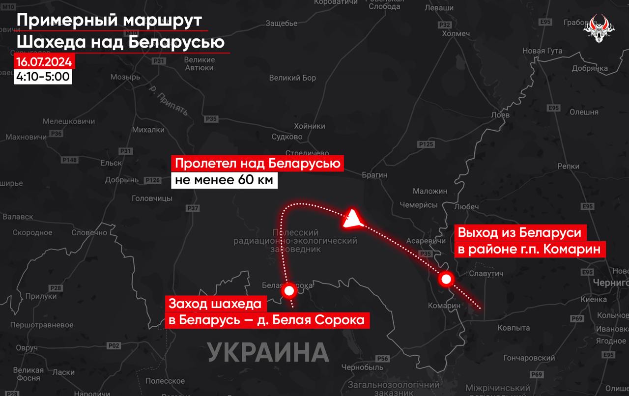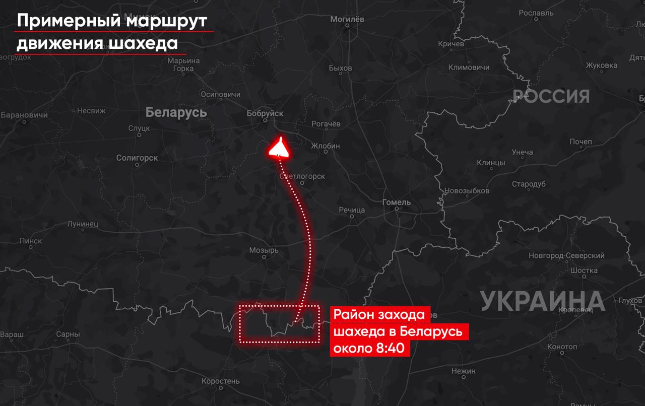 Вночі дрон-камікадзе зайшов в районі села Біла Сорока на території Поліського радіаційно-екологічного заповідника і рухався на північ, у напрямку Хойніков. Далі БПЛА здійснив поворот на південний схід і, оминувши Брагін, попрямував у бік Комарина. О 5-й ранку "шахед" повернувся на територію України. Сумарно дрон-камікадзе провів на території РБ близько 50 хвилин.