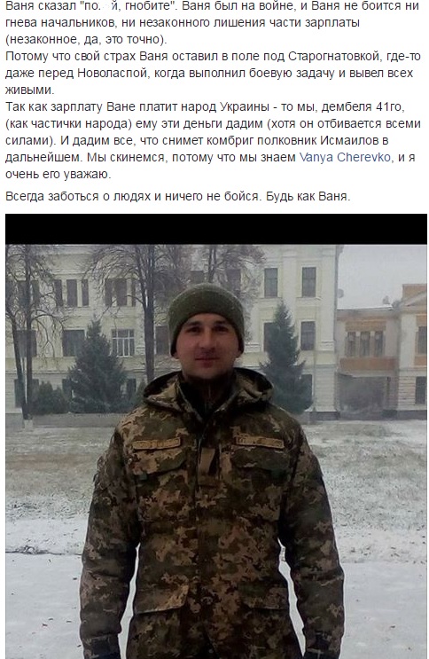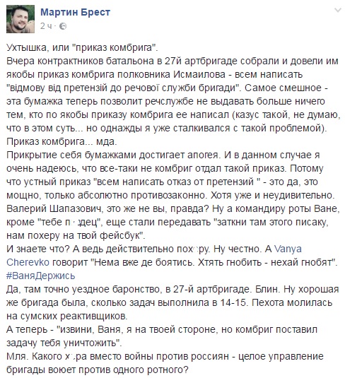 Зараз, пише Брест, Ісмаїлов зажадав від військовослужбовців 41-го батальйону написати відмову від претензій до речової служби бригади. За словами волонтера, це дозволить речовий службі взагалі нічого не видавати бійцям. Також Брест підкреслив, що зараз продовжується цькування Івана Черевко.