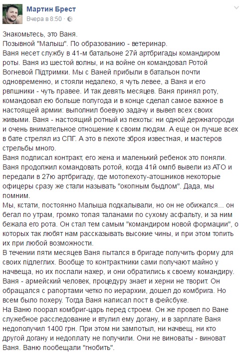 Начальство 27-ї артилерійської бригади ЗСУ початок відкриту цькування проти командира роти 41-го батальйону Івана Черевко.