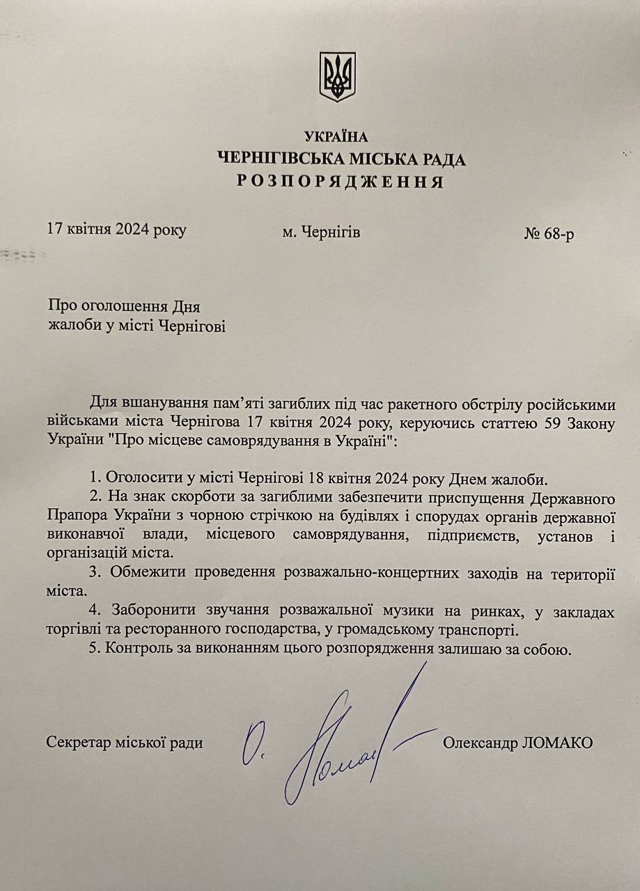 У четвер, 18 квітня, у місті оголошено жалобу. Про це повідомив і виконуючий обов'язки Чернігівського міського голови, секретар міської ради Олександр Ломако.