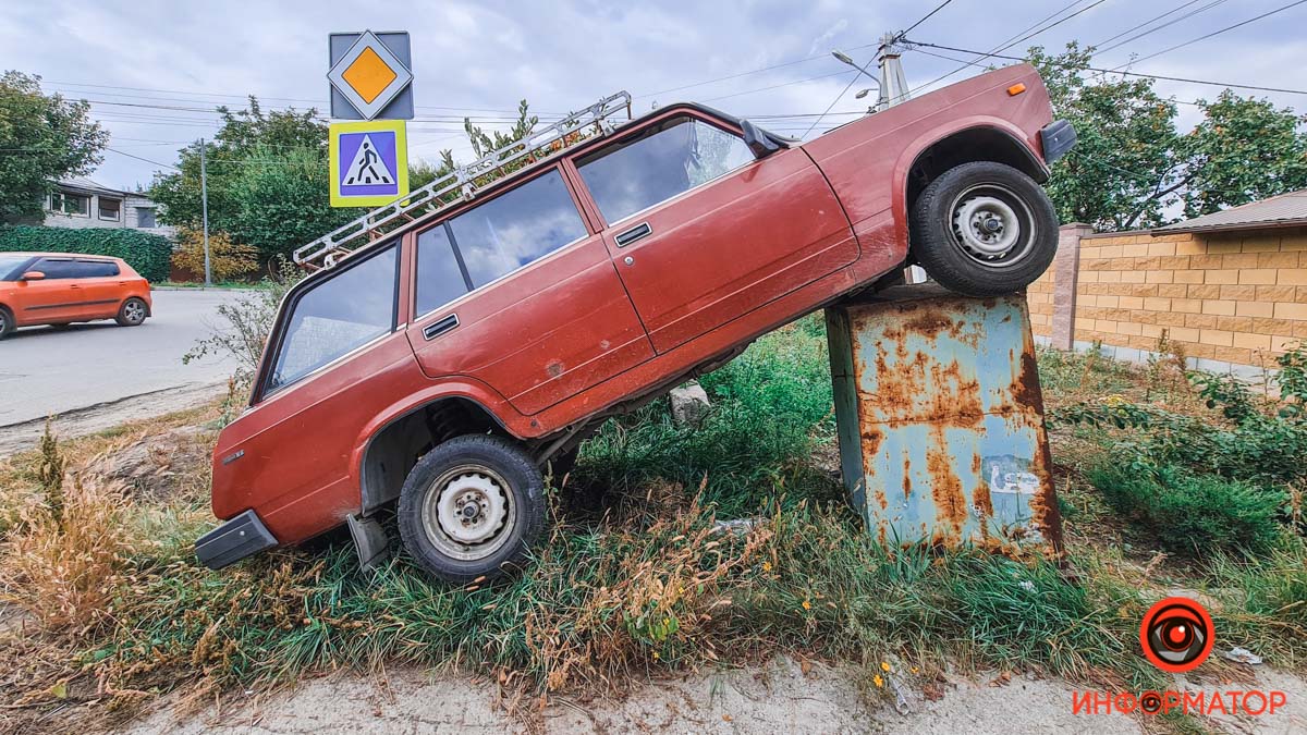 У п'ятницю, 16 жовтня, в місті Дніпро, на вулиці Воронезькій зіткнулися Volkswagen і ВАЗ. В результаті ДТП ВАЗ налетів на металевий сміттєвий бак, передня частина машини повисла в повітрі.