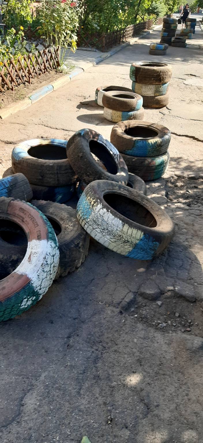 Як написали в коментарях, дорогу заставили шинами спеціально - так група місцевих бабусь бореться з тим, щоб у двір не заїжджали і не паркувалися машини.