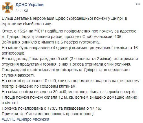 Постраждалих оспіталізовано до лікарень Дніпра, стан середнього ступеня важкості. На пожежі врятовано 10 осіб, яких за допомогою апаратів на стисненому повітрі виведено із приміщення.