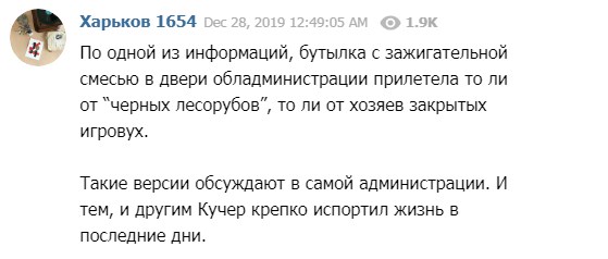 "За однією з інформацій, пляшка із запальною сумішшю в двері обладміністрації прилетіла чи то від "чорних лісорубів", чи то від господарів закритих ігровух", - пишуть в Telegram-каналі.