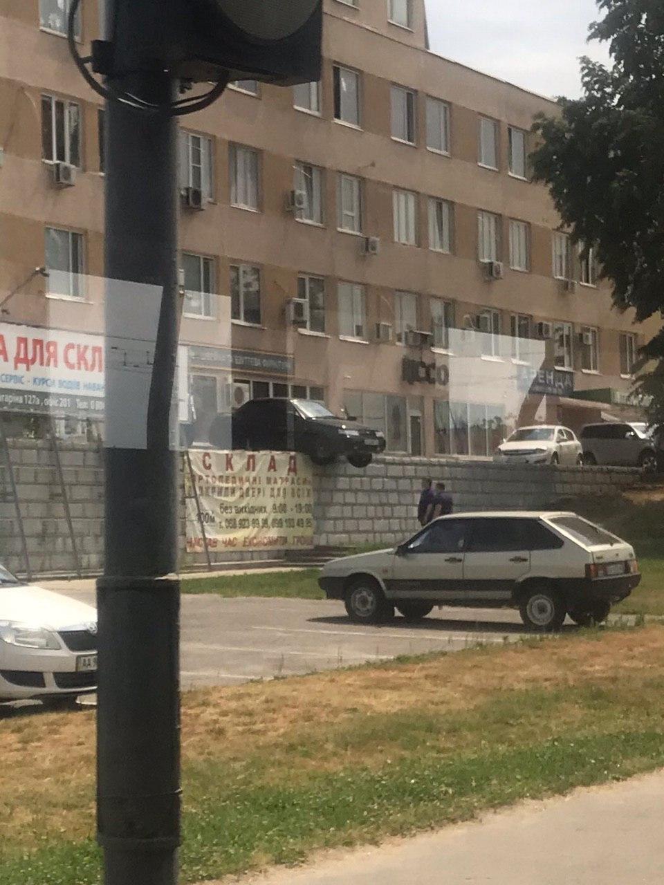 Як видно на фото, водій не розрахував швидкість автомобіля під час паркування, в результаті чого його авто вилетіло передніми колесами за межі майданчика і зависло в повітрі.