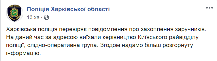 "Харківська поліція перевіряє повідомлення про захоплення заручників. На даний час за адресою виїхали керівництво Київського райвідділу поліції, слідчо-оперативна група", - йдеться в повідомленні.