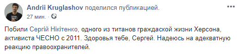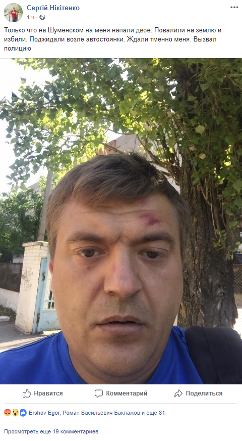"Поліція не знайде нападників, тому що є страх вийти на себе ж. Зараз викликали швидку, їде поліція… Це не політика. Це неоголошена війна проти активних громадян", "Здоров'я тобі, Сергію. Сподіваюся на адекватну реакцію правоохоронців", - пишуть в інтернеті.