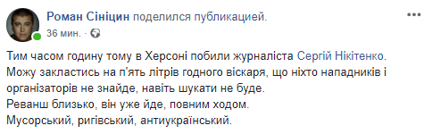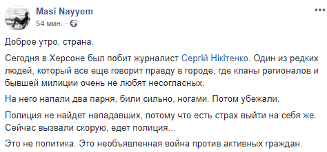 У понеділок, 18 червня, в Херсоні двоє невідомих жорстоко побили журналіста Сергія Нікітенка.
