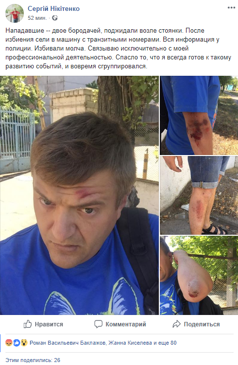 "Після побиття сіли в машину з транзитними номерами. Вся інформація у поліції. Били мовчки. Пов'язую виключно з моєю професійною діяльністю. Врятувало те, що я завжди готовий до такого розвитку подій, і вчасно згрупувався", - зазначив Нікітенко.