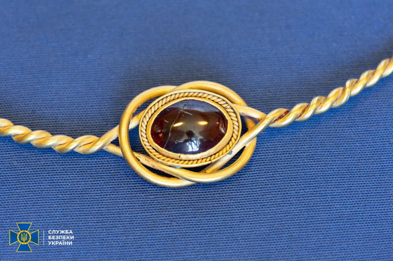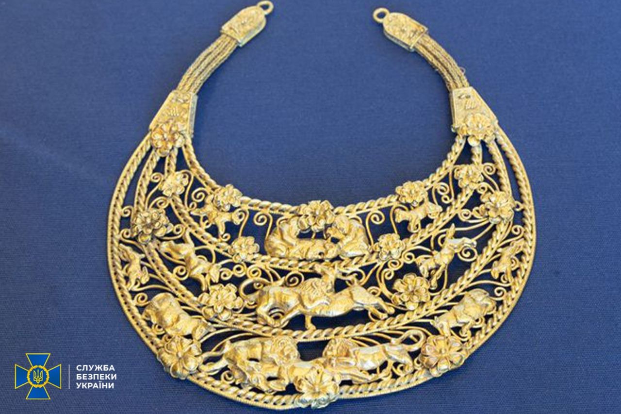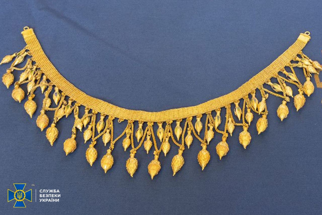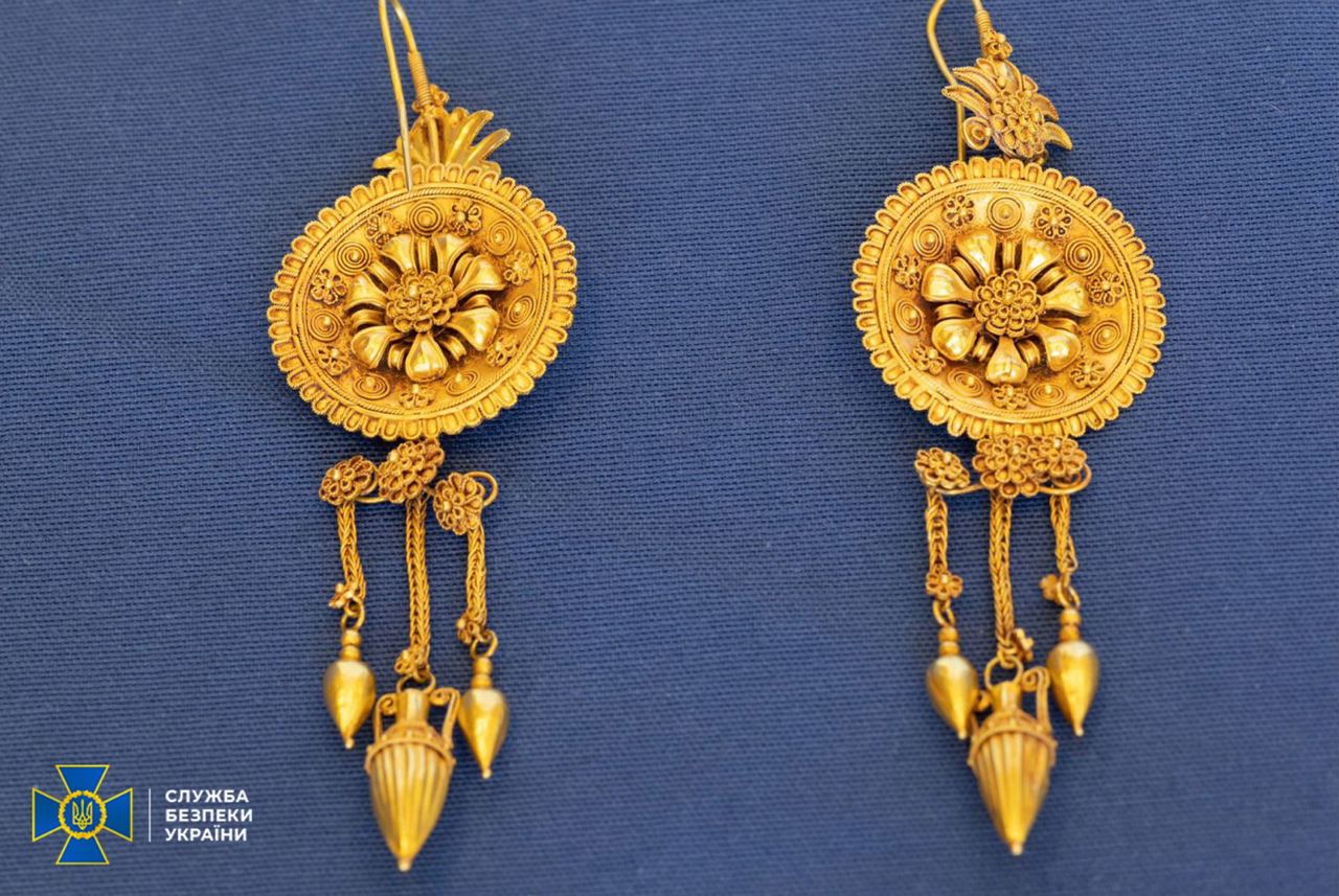 У контрабандистів вилучено 11 викрадених золотих предметів на суму понад 60 млн євро: дорогоцінні предмети VIII-IV століть до нашої ери - сережки, кулон, чокери та пектораль, які зловмисники нелегально вивезли з України до Євросоюзу у період 2014-2020 років.