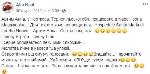 Про трагічну звістку в Facebook повідомила подруга українки Алла Кисіль. За її даними, Анна Артим померла 30 грудня.