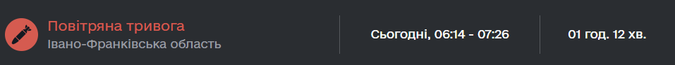 Повітряна тривога в Івано-Франківській області розпочалася о 06:14 та тривала до 07:26.