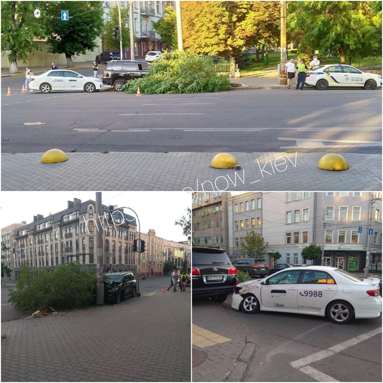 ДТП сталася на розі вулиць Антоновича і Федорова, там зіткнулися два автомобілі. Одна машина в'їхала в стовп і повалила дерево.