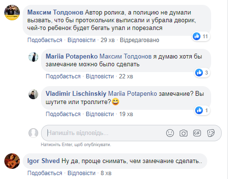 "Автор ролика, а поліцію ви не думали викликати? Щоб протокол виписали і вона прибрала дворик. Чиясь дитина буде бігати, впаде та поріжеться", - написав користувач Максим Толдонов.