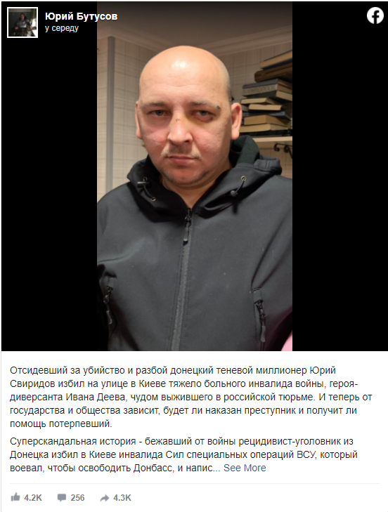 "Донецький тіньовий мільйонер Юрій Свиридов, який відсидів за вбивство і розбій, побив на вулиці в Києві тяжкохворого інваліда війни, героя-диверсанта Івана Дєєва, який чудом вижив у російській тюрмі. І тепер від держави та суспільства залежить, чи буде покараний злочинець та чи отримає допомогу потерпілий", – написав Бутусов.