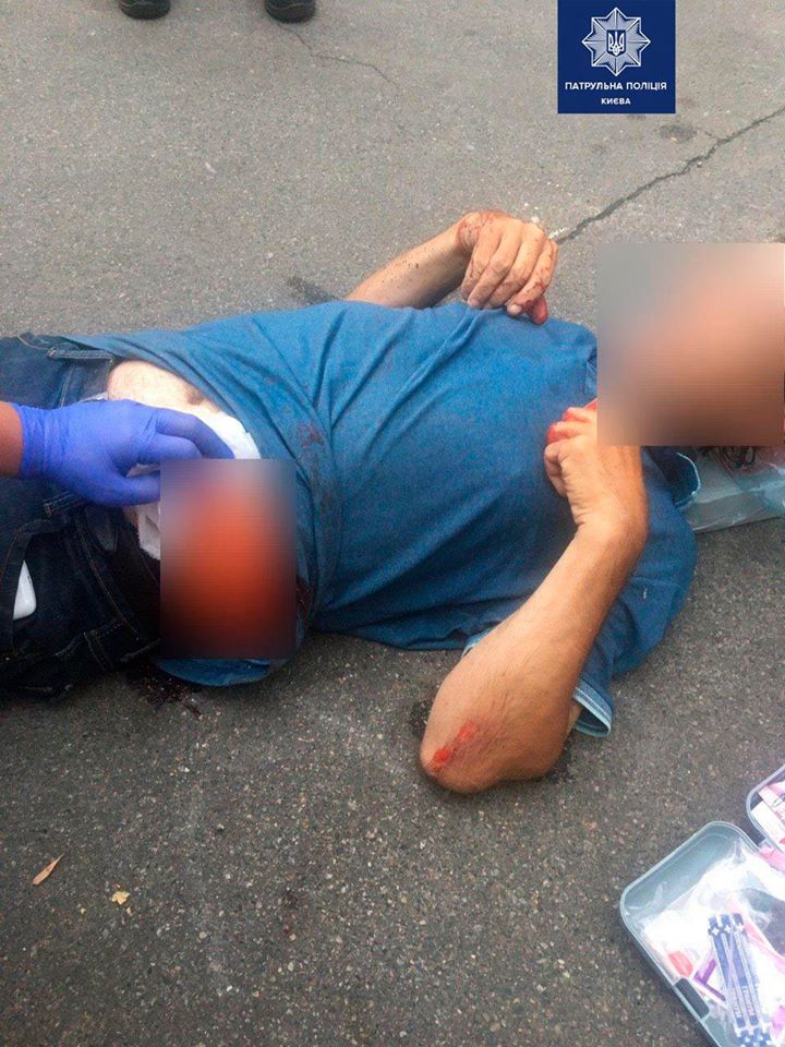 В цей же час в поліцію надійшов виклик про тілесні ушкодження. Співробітники охоронного холдингу виявили чоловіка з проникаючим ножовим пораненням, який лежав на землі. Вони надали йому першу допомогу і викликали медиків. Потерпілий описав нападника, опис збігалося з зовнішнім виглядом затриманого раніше чоловіка.