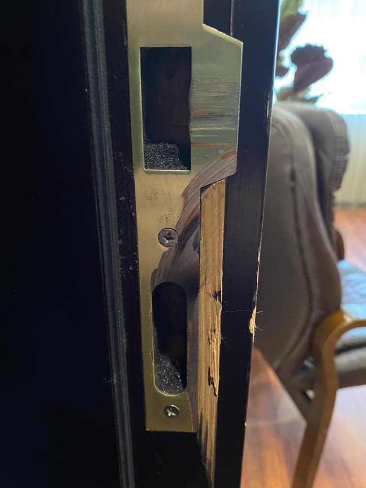 Оскільки зі зворотного боку дверей був вставлений ключ, злочинці, очевидно, використовували болгарку або інший інструмент, щоб спиляти ригелі. Спиляні ригелі вони забрали, поставивши нові.
