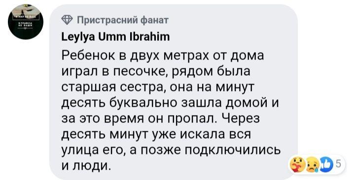 "У селищі Строганівка Сімферопольського району пропав син політв'язня Руслана Сулейманова - 3-річний Муса Сулейманов. Дитина бавилася у пісочниці біля будинку, за адресою вул. Азатлик, 8. Востаннє його бачили на початку 6-ї години вечора (24 липня – ред.). Дитина одягнена у сіру трикотажну футболку, сині шорти та білі капці", - йдеться в повідомленні.