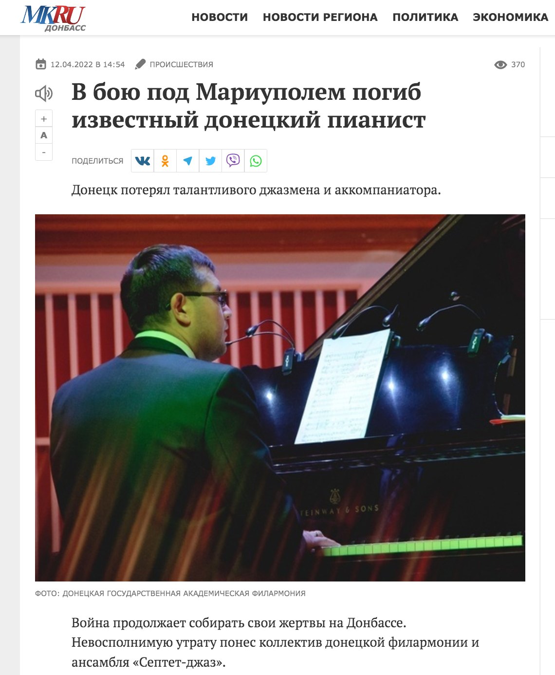 Про загибель відомого піаніста в Маріуполі також повідомив блогер, член політичної партії "Демократична сокира" Антон Швець. За його словами, військове командування РФ не вважає за людей жителів окупованих територій, тому проводить мобілізацію і відправляє непідготовлених громадян у зону бойових дій.