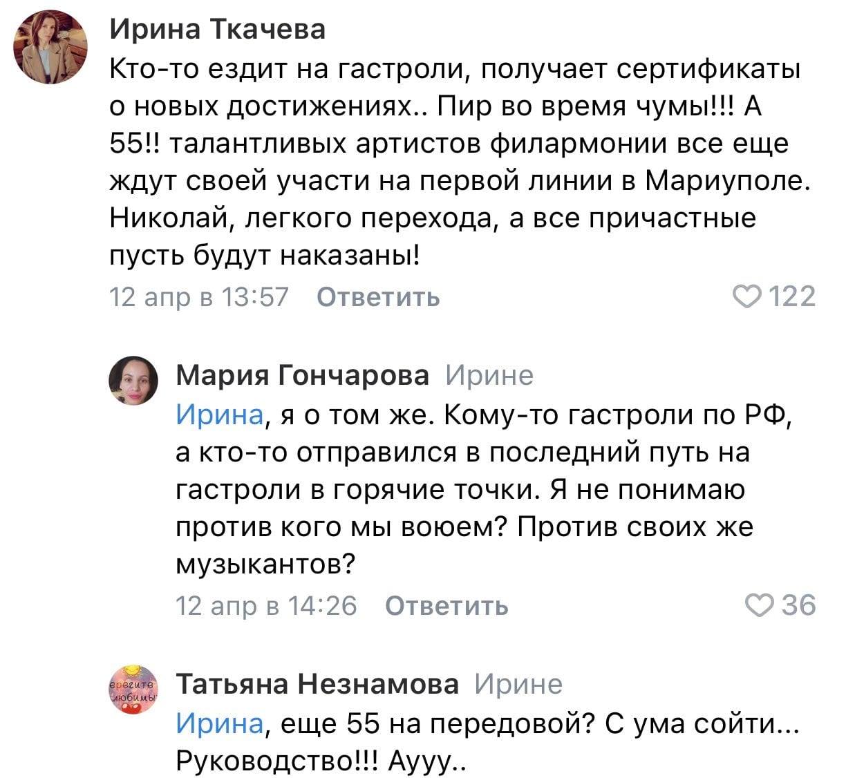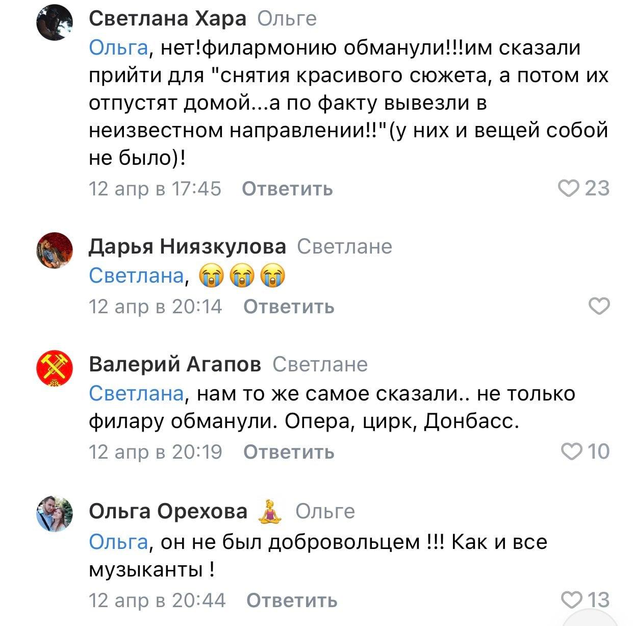 "Прості працівники філармонії кажуть, що "начальство філармонії" обдурило підлеглих та відправило їх типу записувати сюжет на ТБ, де їх "мобілізували" та в цивільному одязі відправили на пункт. А близькі до "начальства" люди кажуть, що це філармонію та її "начальство" обдурило "керівництво республіки" і типу сказало дайте людей для сюжету, а самих людей вкрало та кинуло в м'ясорубку", - додав блогер.