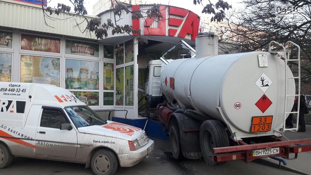 На селищі Котовського в Одесі бензовоз протаранив кілька припаркованих уздовж проїзду автомобілів і влетів в магазин.