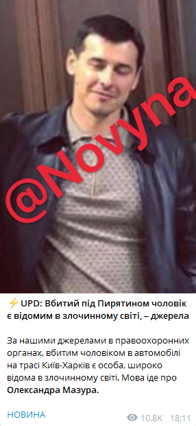 Канал повідомляє посиланням на власні джерела в правоохоронних органах, що вбитий чоловік в автомобілі на трасі Київ-Харків є особою, що широко відома в злочинному світі. Йдеться про Олександра Мазура.