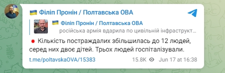 Кількість постраждалих від російського обстрілу на Полтавщині збільшилася до 12 осіб, серед них двоє дітей, трьох осіб госпіталізували.